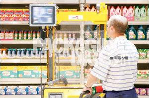 當(dāng)未來商店收到貨物時,員工把貨盤從卡車上搬運(yùn)著穿過商店后門的另一個RFID門。掃描器可以每秒最多識別35個標(biāo)簽。這時,商品狀態(tài)變?yōu)椤暗赇佉咽肇洝薄H缓蟠蠖鄶?shù)商品在倉庫臨時存放。每個存放位都安裝了一個智能芯片。在將每個貨箱放在貨架上時,用一個手持掃描器讀取、匹配箱子上的芯片和貨架上的芯片。員工現(xiàn)在能準(zhǔn)確地知道每件商品放在哪里了。