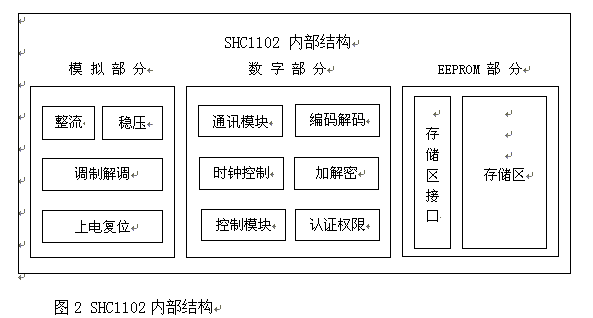 SHC1102是上海華虹集成電路有限公司的非接觸式IC卡芯片系列產品之一,其內部結構主要由射頻接口電路、電源電路、邏輯控制電路、EEPROM存貯單元電路四個部分組成,如圖2所示。