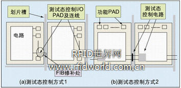 圖5a是在接觸式智能卡芯片的發(fā)展過程中曾大量采用的測(cè)試態(tài)控制方式:使用額外的I/O管腳和芯片內(nèi)部電路相連,該連線通過劃片槽,這樣芯片劃斷后就不能通過簡(jiǎn)單控制該管腳進(jìn)入測(cè)試態(tài)。由于FIB修補(bǔ)技術(shù)的出現(xiàn),這個(gè)手段已經(jīng)過時(shí)。圖5b是最有潛力的替代方案:在劃片槽和鄰近的芯片中設(shè)計(jì)部分控制電路,從而得到不可逆的測(cè)試態(tài)控制手段。