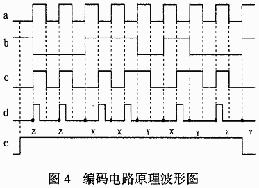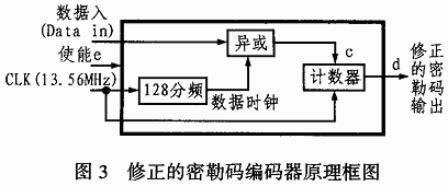 實現(xiàn)修正的密勒碼編碼的硬件電路編碼器的原理框圖如圖3所示。圖4所示是假定輸出數(shù)據(jù)為011010時,采用圖3方案的波形圖,其中,使能信號e用于激活編碼器電路以使其開始工作。波形a為數(shù)據(jù)時鐘,b為數(shù)據(jù)輸入端波形,它的第一位為起始位,用于送出不歸零碼0,第二位至第七位為數(shù)據(jù)信息,其后是結(jié)束位,也應(yīng)以不歸零碼輸出。編碼電路要將00110100變換成修正的密勒碼編碼。從圖中可以發(fā)現(xiàn),a和b異或(模2加)后形成的波形c有一個特點,即其上升沿正好對應(yīng)于X、Z時序所需的“pause”的起始位置,因此,可以用c波形控制計數(shù)器的開始,以對13.56MHz時鐘計數(shù),若按模8計數(shù),則d波形中的“pause”脈寬應(yīng)為8/13.56即0.59μs,因而可滿足TYPE A中“pause”凹槽脈沖底寬的要求。這樣,通過波形d中輸出的相應(yīng)時序ZZXXYXYZY即可完成修正密勒碼的編碼。當送完數(shù)據(jù)后,拉低使能電平,編碼器停止工作。