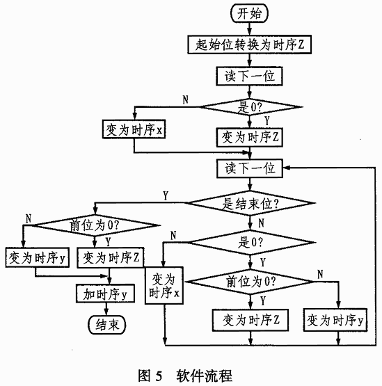 該編碼器的軟件編程方法比較簡單,可以按X、Y、Z時序編寫相應(yīng)子程序,然后將輸出數(shù)據(jù)塊從通信起始位至通信結(jié)束位,一位一位地按編碼規(guī)則轉(zhuǎn)換為相應(yīng)時序,其流程見圖5所示。