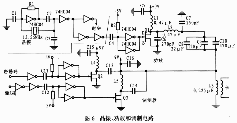 13.56MHz的射頻輸出電路應(yīng)能達到標準所提出的作用距離及電磁性能要求。圖6給出了一種采用戊類(E類)功率放大器產(chǎn)生的13.56MHz射頻功率輸出電路,該電路由13.56MHz晶振信號激勵。晶體振蕩電路由74HC04、13.56MHz晶體及少量輔助器件組成。該功率放大器由于采用戊(E)類放大器,其晶體管處于開關(guān)狀態(tài),因而效率很高。