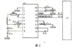 芯片的操作由SHD和MOD控制。SHD為高時進入睡眠模式,在芯片供電之后,SHD必須為高以對芯片進行正確的初始化,然后SHD再接低電平,這樣芯片可以發出射頻場,由解調模塊將線圈上讀到的信號由DEMOD__OUT輸出。MOD接地使芯片進入只讀狀態。應用圖如下圖2所示。