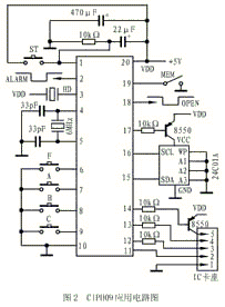 CIPH09芯片是IC卡電子密碼鎖的核心,它具有密碼設置、插卡檢測、IC卡讀寫以及插卡開鎖等功能。修改密碼時,由鍵盤輸入的用戶密碼不僅被寫入密碼控制器的24C01A EEPROM中,同時也寫入用戶手持IC卡中;開鎖時,只要將手持IC卡插入IC卡座中即可將電控鎖體開啟,使用方便,開鎖快捷,特別適合老人等記憶力差的人員使用。此外,IC卡作開鎖鑰匙,通用性強,即便在丟失、損壞等情況下,也可借用別人的IC卡作臨時開鎖鑰匙,即將IC卡插入密碼控制的IC卡座上,在非密碼設置狀態下,由鍵盤輸入原密碼后再按一下“F”功能鍵,此時即可將輸入密碼寫入IC卡的備用存儲區域中,而且不影響被借用戶密碼信息。將該IC卡插入自己的IC卡座后,一方面將電控門鎖打開,另一方面清除IC卡備用存儲區中的密碼信息,以防別人持卡開啟自己的門鎖。