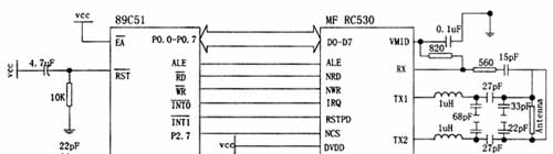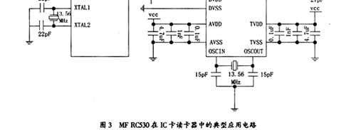 圖3所示為MFRC530在非接觸式IC卡讀卡器中的典型應(yīng)用電路。